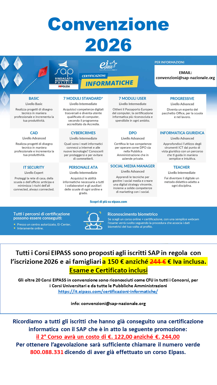 La Segreteria Provinciale SAP Torino ha stipulato un’importante convenzione con lo Studio Legale Speranza. Lo studio offre la prima consulenza GRATUITA a tutti gli iscritti e famigliari e successivamente...